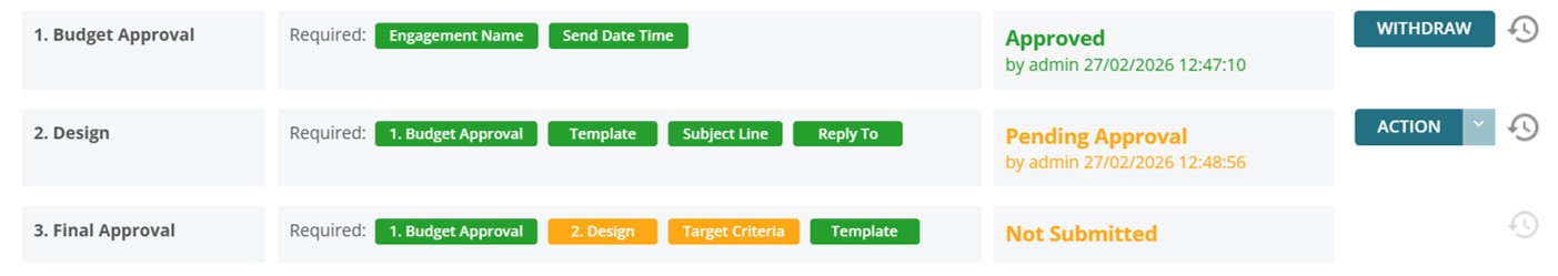 Before the first scheduled pre-campaign engagement is scheduled to run, make sure that all necessary approvals have been obtained. Approval workflows usually cover budget, design, and final approval, but custom workflows may also apply.